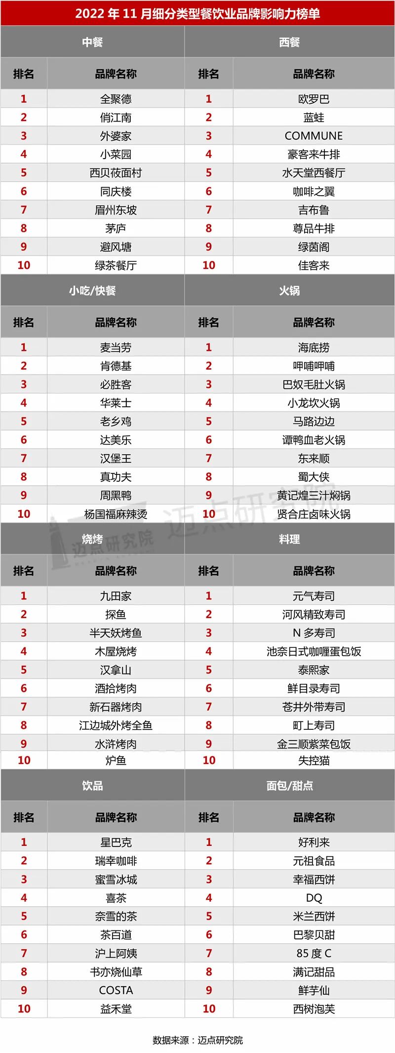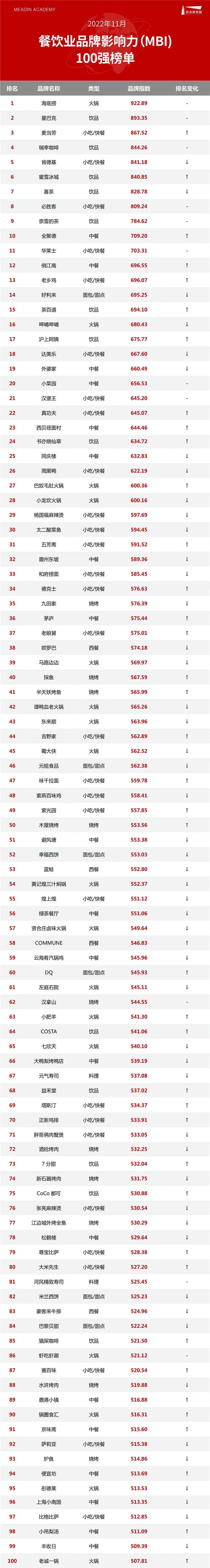 以下是邁點(diǎn)研究院獨(dú)家發(fā)布的“2022年11月餐飲業(yè)品牌影響力(MBI)100強(qiáng)榜單”。本月海底撈、星巴克、麥當(dāng)勞、瑞幸咖啡、肯德基、蜜雪冰城、喜茶、必勝客、奈雪的茶、全聚德進(jìn)入榜單前十。TOP10品牌中,飲品品牌熱度依然最高,占5席;其次是小吃/快餐品牌占3席,而火鍋和中餐品牌各占1席。相比10月,本月100強(qiáng)榜單中,共有40個(gè)品牌排名上升,49個(gè)品牌排名下降,11個(gè)品牌排名沒有變化。