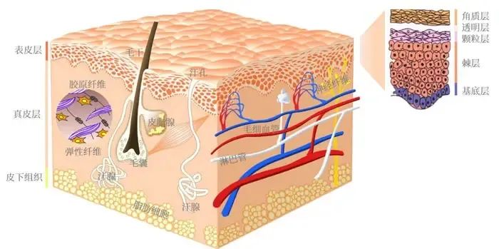 在解釋3D皮膚模型前,我們需要先清楚人體的皮膚結(jié)構(gòu)。人體皮膚可分為3層:表皮、真皮及皮下組織。各層含有的具體結(jié)構(gòu)和細胞組成請參照以下結(jié)構(gòu)圖和思維導圖: