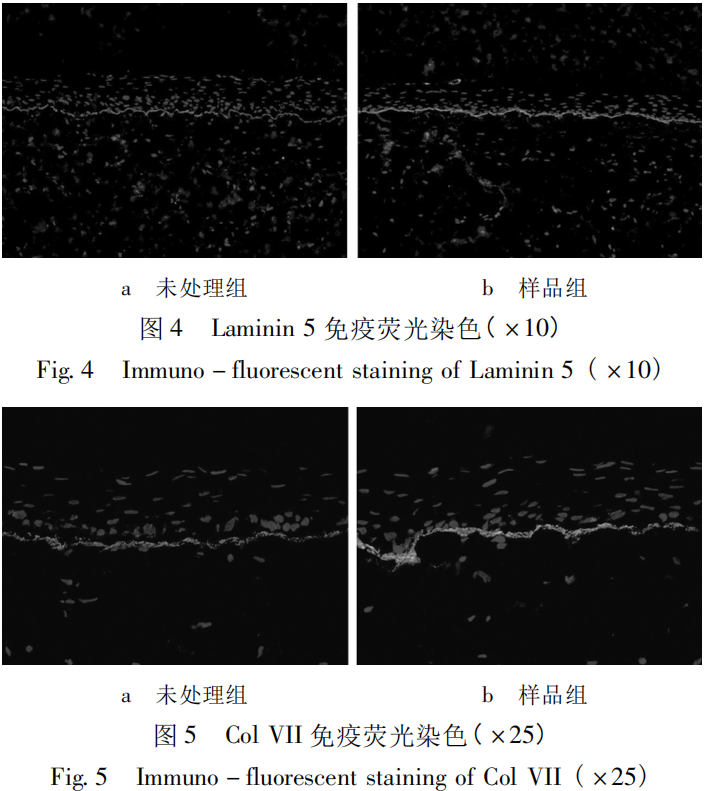 (注:DEJ具有緊致表皮,進行真皮-表皮間物質(zhì)交換的作用。研究表明,DEJ 的健康與否,直接影響皮膚的整體狀態(tài),維持健康的DEJ是預防衰老的關(guān)鍵;Laminin 5和Col VII是DEJ內(nèi)的重要蛋白,兩者表達量的增加能穩(wěn)固DEJ結(jié)構(gòu)。)