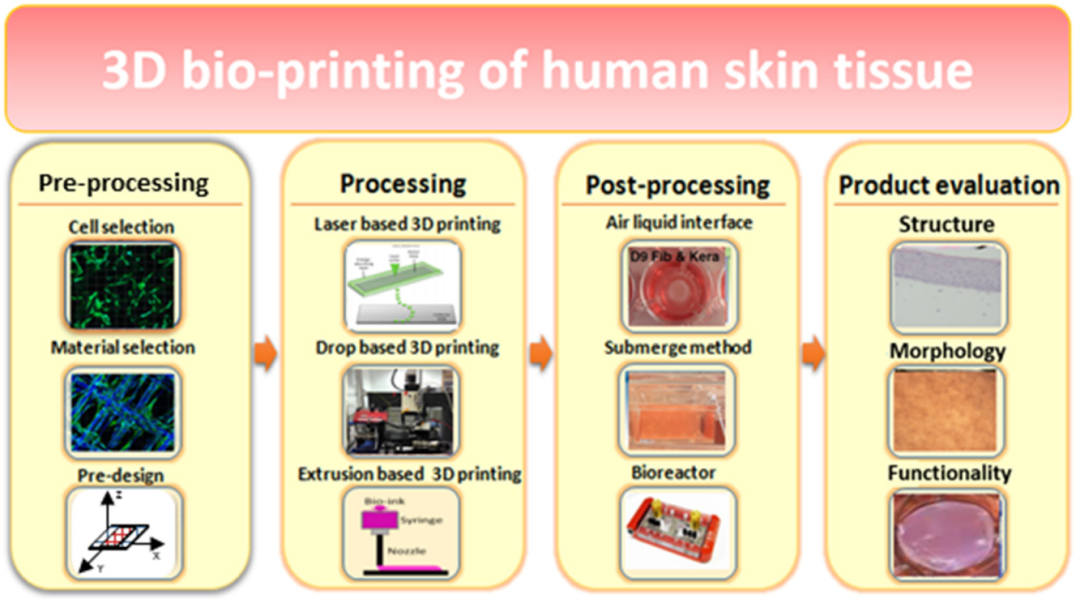 3D打印皮膚的制造過程可分為四步:a、前處理:包括皮膚細胞選擇、生物材料選擇和模型設(shè)計;b、實際打印過程;c、后處理:包括3D打印皮膚細胞的增殖、組織的形成和成熟;d、3D打印皮膚的評價:包括皮膚組織的生化和生理特征。