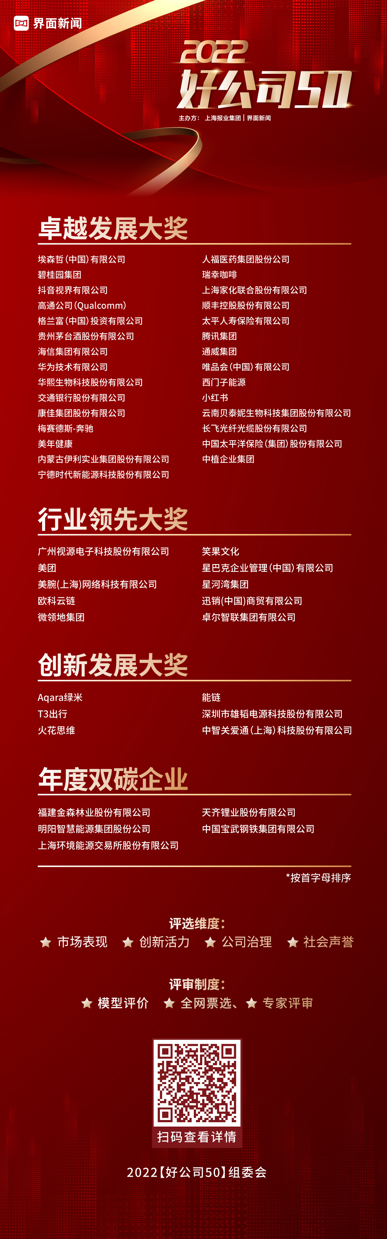 12月20日,上海報(bào)業(yè)集團(tuán)|界面新聞在上海中心舉辦了【2022好公司50】頒獎典禮,并正式公布了年度TOP50年度榮譽(yù)榜單(*按首字母排序)——