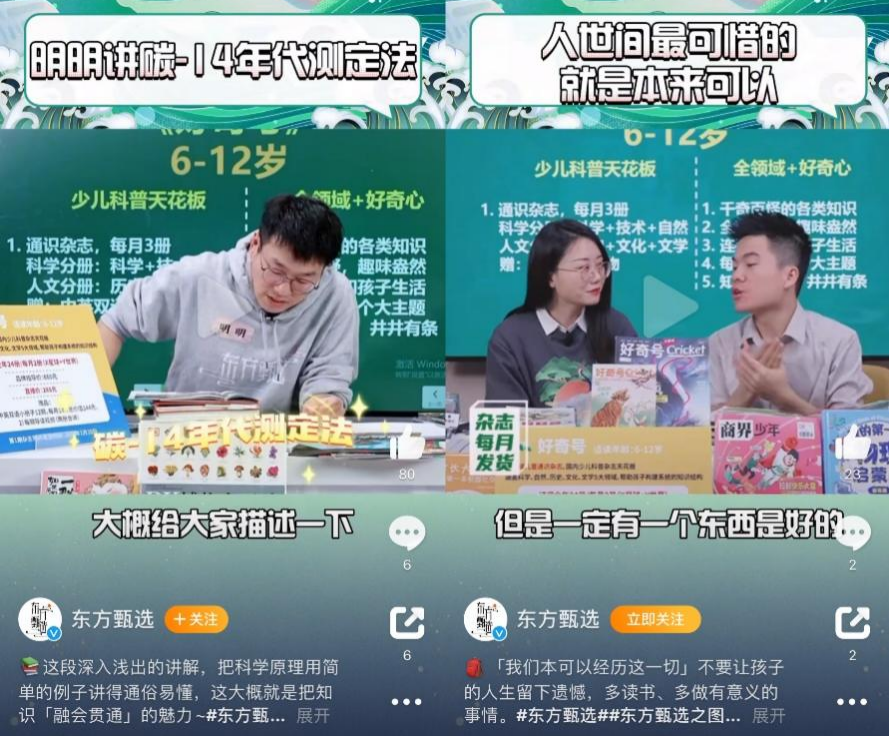 其中值得一提的當屬東方甄選,被粉絲戲稱為“中關(guān)村周杰倫”的董宇輝帶領(lǐng)著東方甄選團隊走出了一條與眾不同,又難以模仿的直播路線。他的爆火要回溯到6月9日,他和往常一樣在直播間進行雙語帶貨,拿著牛排、大米也能夠旁征博引,平靜地講述一個讀書人的情懷與理想。