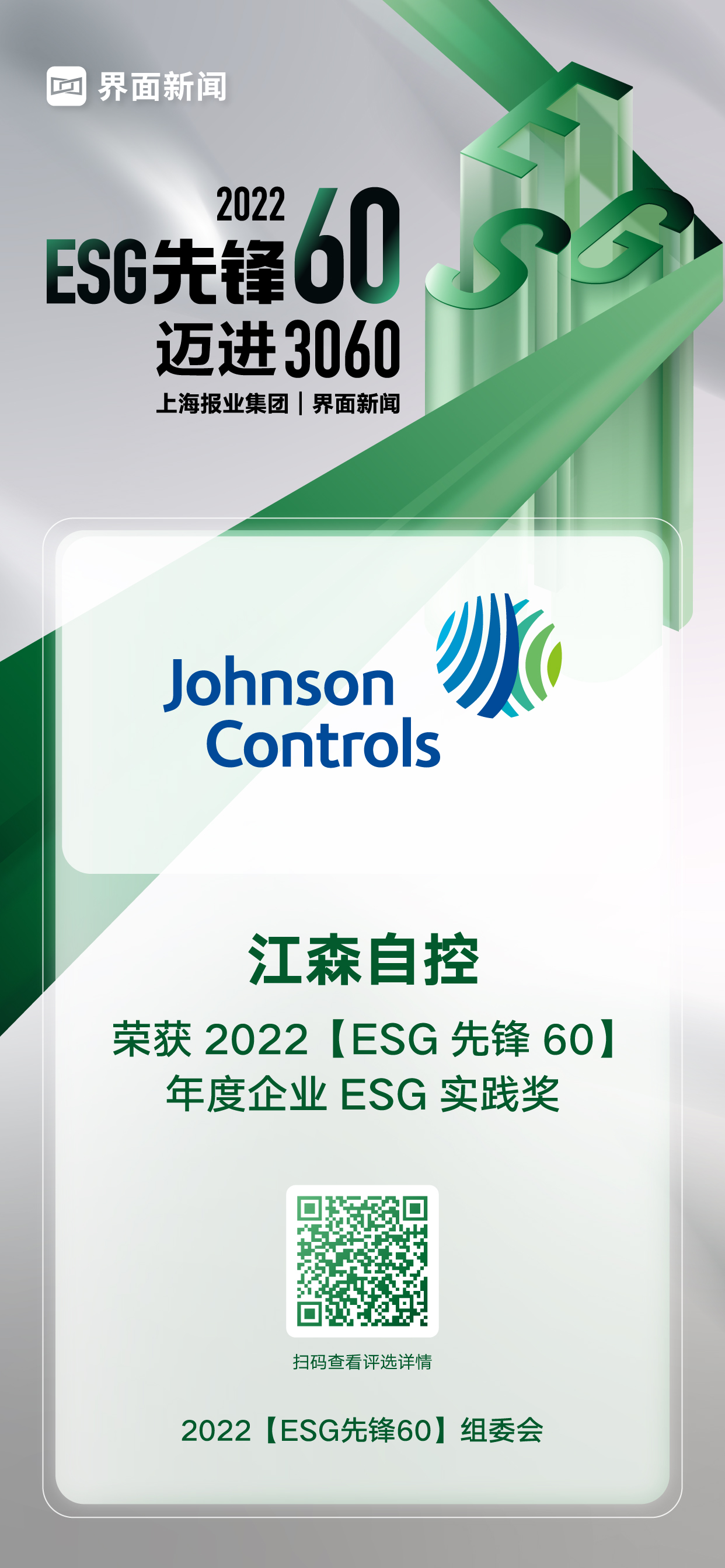 12月20日,上海報業(yè)集團|界面新聞在上海中心舉辦了2022【ESG先鋒60】頒獎典禮,并正式公布了本年度獲獎名單。在這項萬眾期待的關(guān)于ESG議題的年度評選中,來自各行各業(yè)的綠色先鋒企業(yè)與先鋒探索人物,憑借年度市場表現(xiàn)與行業(yè)影響力,獲得年度大獎。其中,江森自控憑借其在行業(yè)內(nèi)的優(yōu)異表現(xiàn),榮膺年度企業(yè)ESG實踐獎。