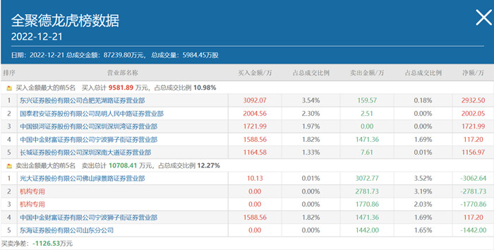 從盤后龍虎榜來看,12月21日,位列買入前三席位的分別是東興證券股份有限公司合肥蕪湖路證券營業(yè)部、國泰君安證券股份有限公司昆明人民中路證券營業(yè)部、中國銀河證券股份有限公司深圳深圳灣證券營業(yè)部,買入金額分別為3092.07萬元、2004.56萬元和1721.99萬元;中國中金財(cái)富證券有限公司寧波獅子街證券營業(yè)部和長城證券股份有限公司深圳深南大道證券營業(yè)部則分列買四、買五席位,買入金額分別為1588.56萬元和1164.58萬元。