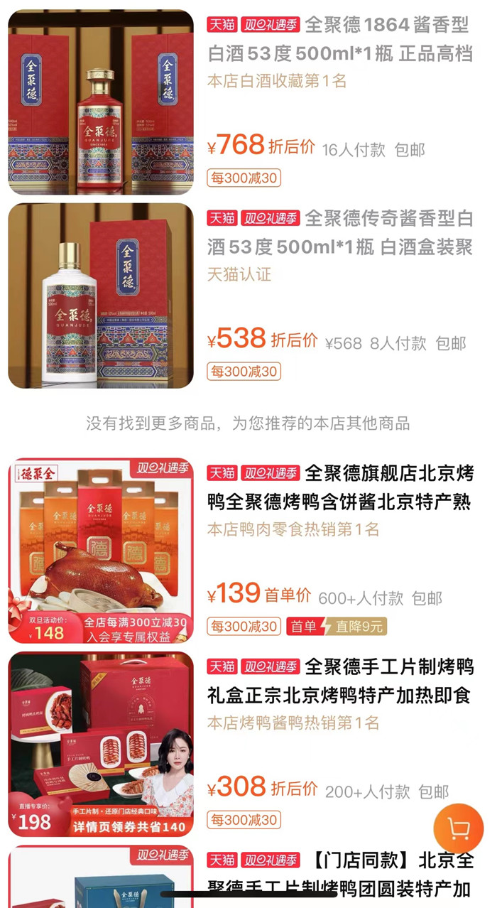 界面新聞?dòng)浾咴谌鄣绿熵埰炫灥曛凶⒁獾剑鲜鰞煽畎拙埔呀?jīng)可以在線上進(jìn)行購買,其中,“全聚德·1864醬香型白酒”售價(jià)828元,折后價(jià)為768元;而另一款“全聚德·傳奇醬香型白酒”售價(jià)為568元,折后價(jià)為538元。