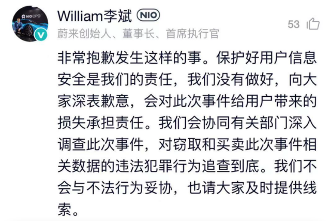 為了安撫用戶情緒,20日晚間,創(chuàng)始人李斌在蔚來(lái)官方社區(qū)就用戶數(shù)據(jù)泄露一事發(fā)文致歉。