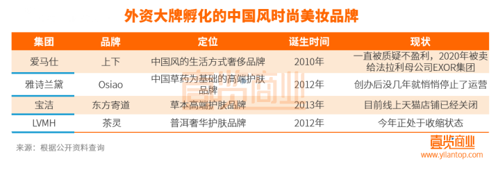 設(shè)計(jì)師蔣瓊耳和愛(ài)馬仕在2010年合作創(chuàng)立了上下,雅詩(shī)蘭黛集團(tuán)于2012年針對(duì)亞洲女性推出了高端護(hù)膚品牌Osiao,也是2012年,寶潔旗下的東方季道正式亮相,次年3月正式上市。茶靈也是2012年正式誕生。