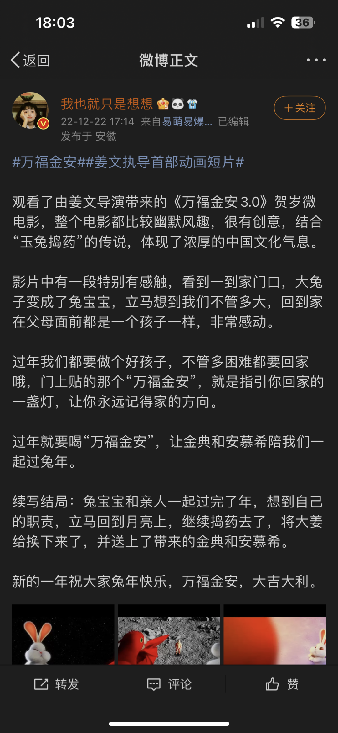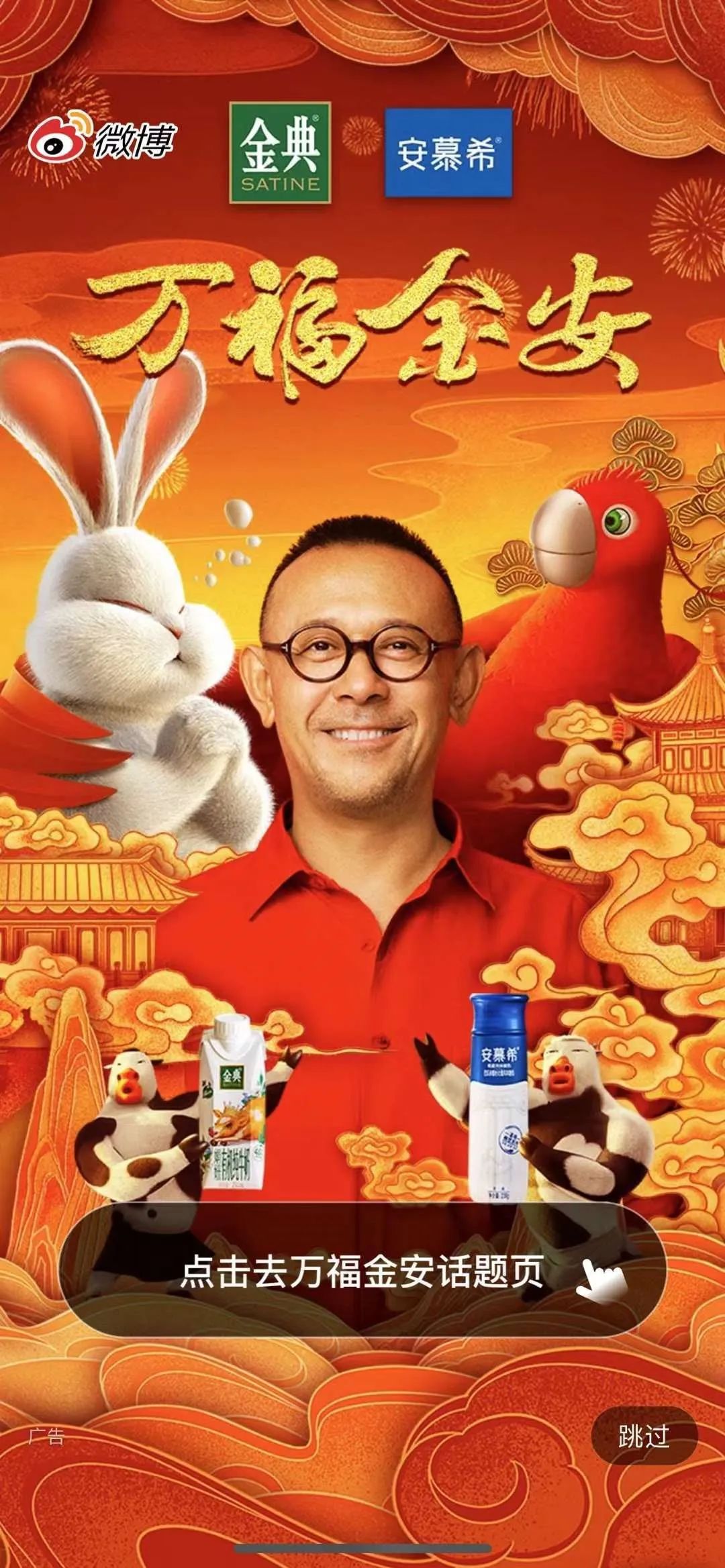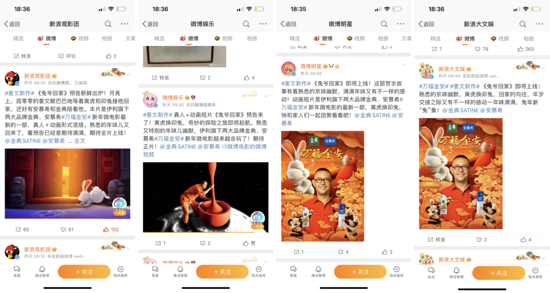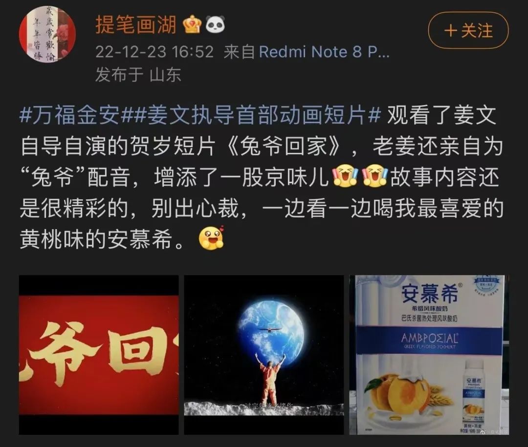 2022年12月22日,金典、安慕希聯(lián)合微博,搶先推出由姜文主演的“萬福金安”系列新短片《兔爺回家》,并在微博、b站等各大主流社交平臺投放投屏廣告,開啟了本年度的春節(jié)營銷活動。