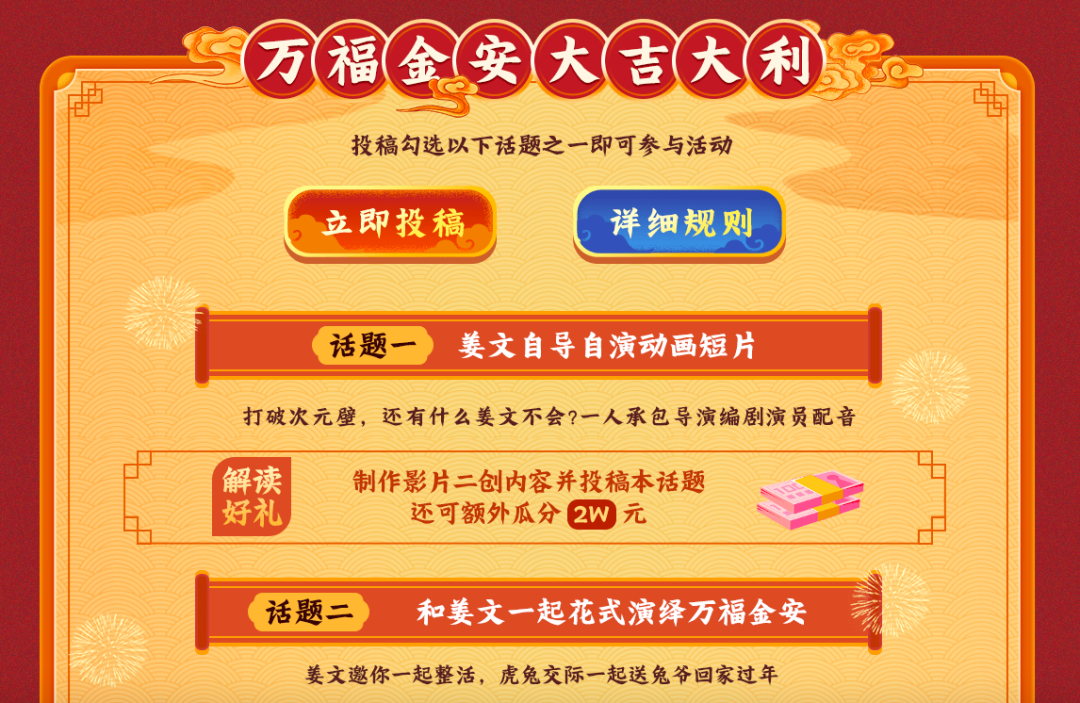 在以年輕人為主的B站,高黏性高聚集互動任務(wù)成為營銷首選。通過設(shè)置“萬福金安大吉大利”互動任務(wù),并設(shè)置豐富的獎勵引導(dǎo)年輕人進(jìn)行二次創(chuàng)作,“萬福金安”短片可以在B站保持長時間的活力,并反過來借助觀眾的影響力,為話題再添上一份熱度。