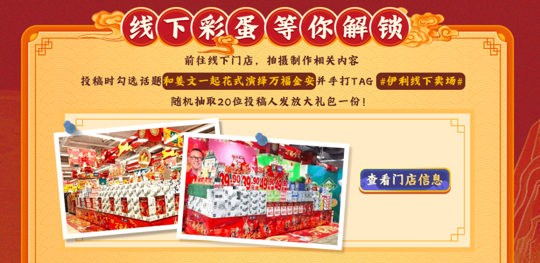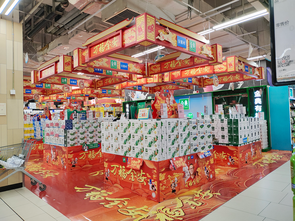 不只有線上,金典、安慕希同時在線下媒體平臺密集投放廣告,形成話題聲量包圍,讓觀眾可以一天多次看到“萬福金安”。在線下商超,以“萬福金安”為主題的專區(qū)展柜也紛紛投放,并和線上營銷投放一起形成系統(tǒng)性營銷格局,形成“看到”就能“買到”的渠道效應(yīng),直接提高流量的轉(zhuǎn)化率。