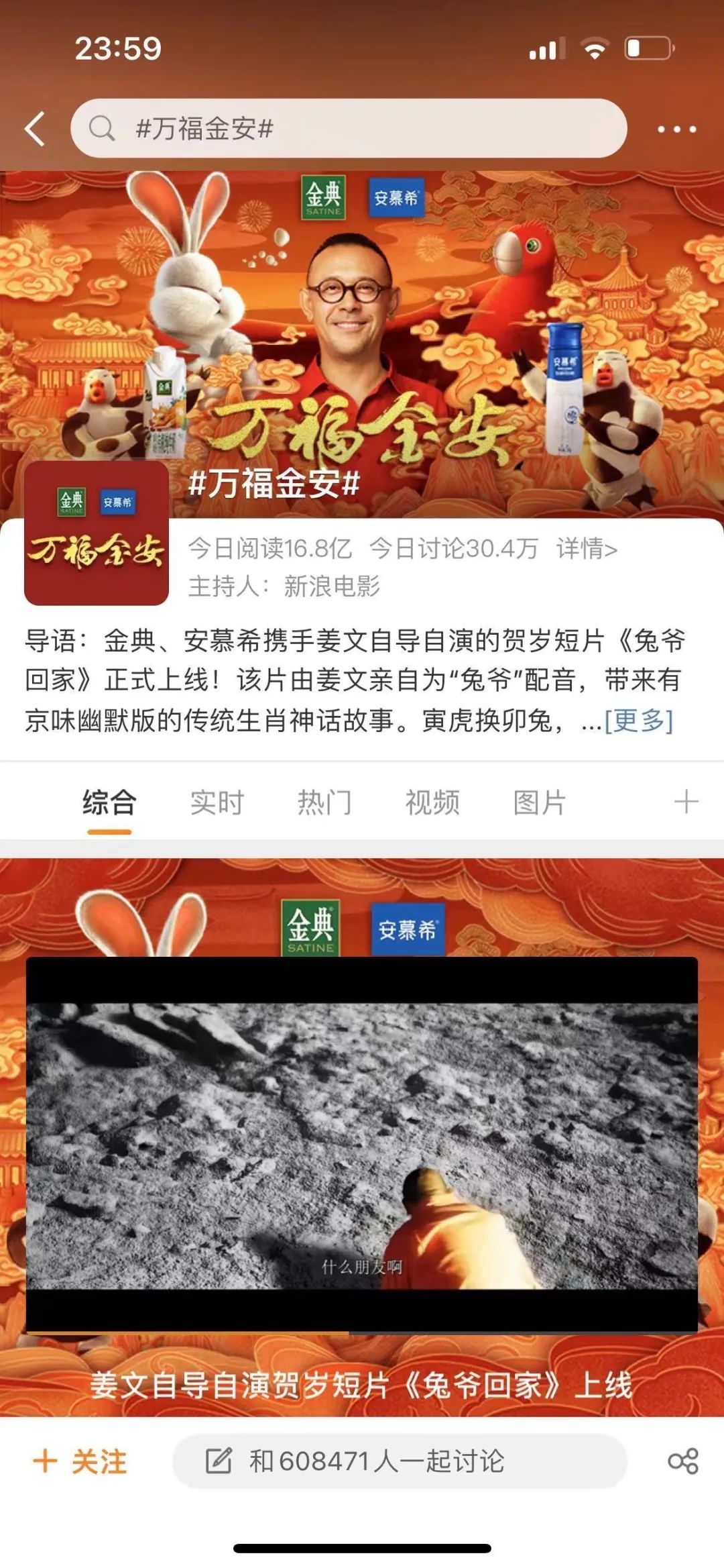 2022年冬至,金典、安慕希的賀歲微電影《兔爺回家》在微博上線。《兔爺回家》是“萬福金安”系列中的第三部,該片選角知名導(dǎo)演姜文,開創(chuàng)性地使用真人+動畫的影片形式,并使用院線電影的宣發(fā)模式進(jìn)行系統(tǒng)性推廣。影片上線首日,僅#萬福金安#這個話題就創(chuàng)造了單日16.8億閱讀,30.4萬討論的話題量。
