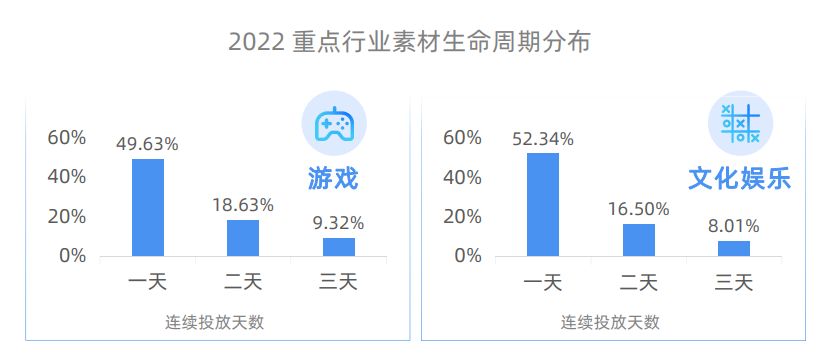 這點(diǎn)也有一些直觀的數(shù)據(jù)體現(xiàn),比如AppGrowing發(fā)布的《2022移動(dòng)廣告流量觀察白皮書》顯示,整體素材生命周期都較短,游戲行業(yè)有49.63%的素材只投放一天,18.63%的素材投放兩天?,F(xiàn)在買量素材以視頻為主且對(duì)廣告質(zhì)量要求越來(lái)越高,廠商成本提升,同時(shí)用戶卻越來(lái)越不愿意點(diǎn)擊,素材復(fù)用率低。