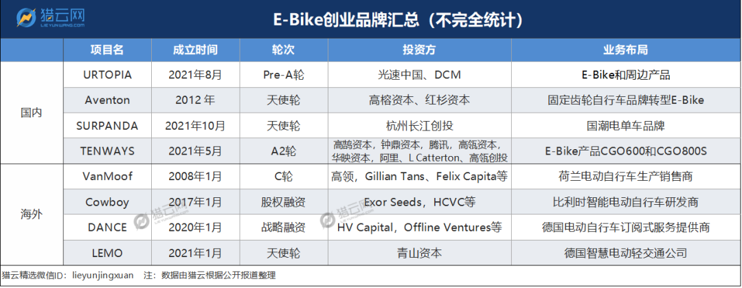 根據(jù)IT 桔子數(shù)據(jù)顯示,2022年,至少有四家中國 E-bike 創(chuàng)業(yè)公司完成融資。除了TENWAYS外,2月,URTOPIA 完成近千萬美元 Pre-A 輪融資,由光速中國和 DCM 共同領投,產(chǎn)品主要面向歐美市場。