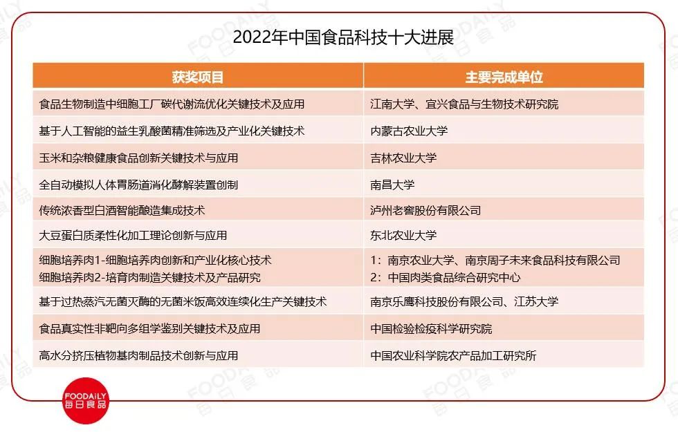 去年12月,中國食品科學(xué)技術(shù)學(xué)會首次頒布2022中國食品科技十大進(jìn)展。涉及細(xì)胞工程、微生物育種、農(nóng)產(chǎn)品技術(shù)創(chuàng)新、腸道健康、釀酒工程、蛋白加工等多個領(lǐng)域。
