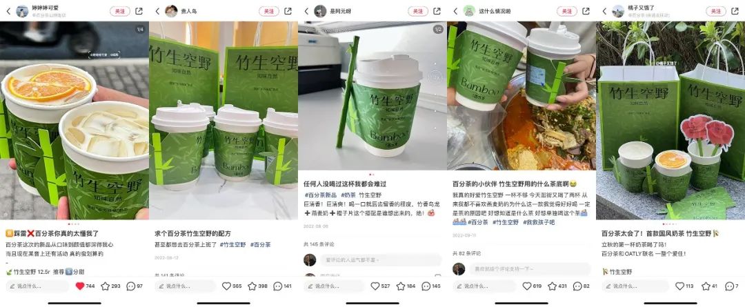 以百分茶“竹生空野”的消費者評價為例,小紅書上有消費者表示,“已連喝三天”“連喝3杯不膩!熊貓的快樂我體會到了”;大眾點評上則有消費者表示“我要向全世界安利這杯東方韻味奶茶”……