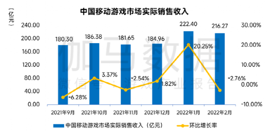 根據(jù)伽馬數(shù)據(jù)《2022年2月移動(dòng)游戲報(bào)告》,中國移動(dòng)游戲市場實(shí)際銷售收入216.27億元,環(huán)比降低2.76%,同比增長2.03%。收入榜前5名分別是:《王者榮耀》《和平精英》《原神》《夢幻西游》《三國志戰(zhàn)略版》。