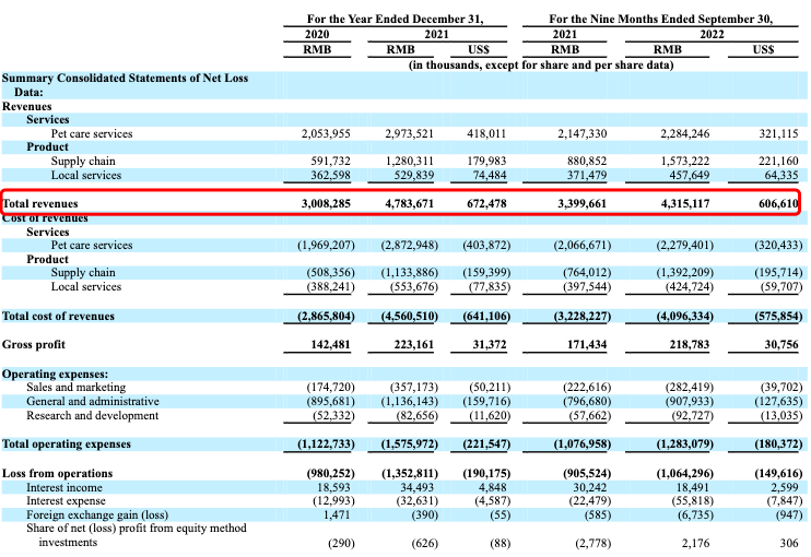 作為寵物江湖的隱秘老大,新瑞鵬營(yíng)收如何?招股書顯示,新瑞鵬2020年、2021年的總營(yíng)收分別為30.08億元、47.84億元;2021年前三季度和2022年前三季度總營(yíng)收分別為34億元、43.15億元。其中,寵物醫(yī)療服務(wù)是新瑞鵬最為主要的收入來(lái)源,占比超50%。不過(guò),新瑞鵬當(dāng)前仍處于“增收不增利”的虧損狀態(tài)——2020與2021兩年凈虧損累計(jì)虧損超20億元,去年前三季度虧了11.09億元。
