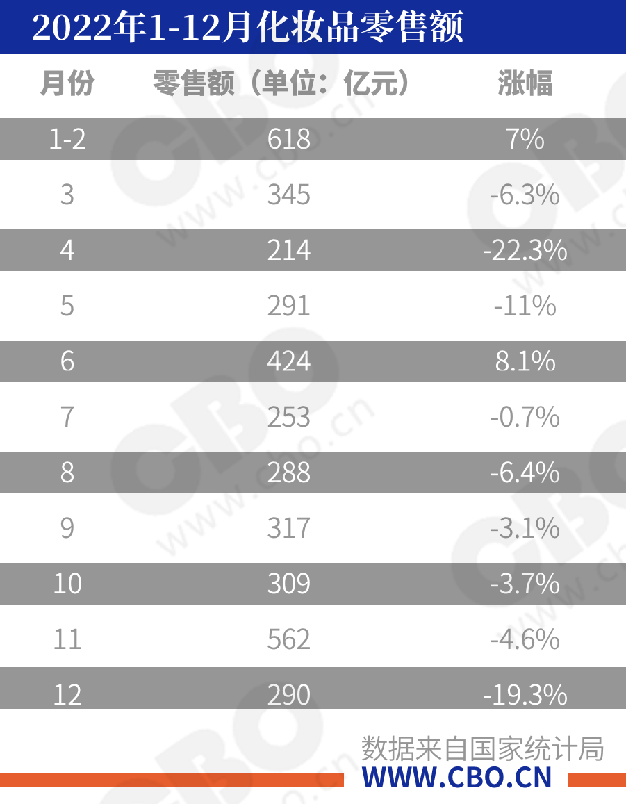 在劃分的18大類別中,化妝品2022年零售總額為3936億元,比上年下降4.5%,其中12月份零售數(shù)據(jù)為290億元,同比下滑19.3%。