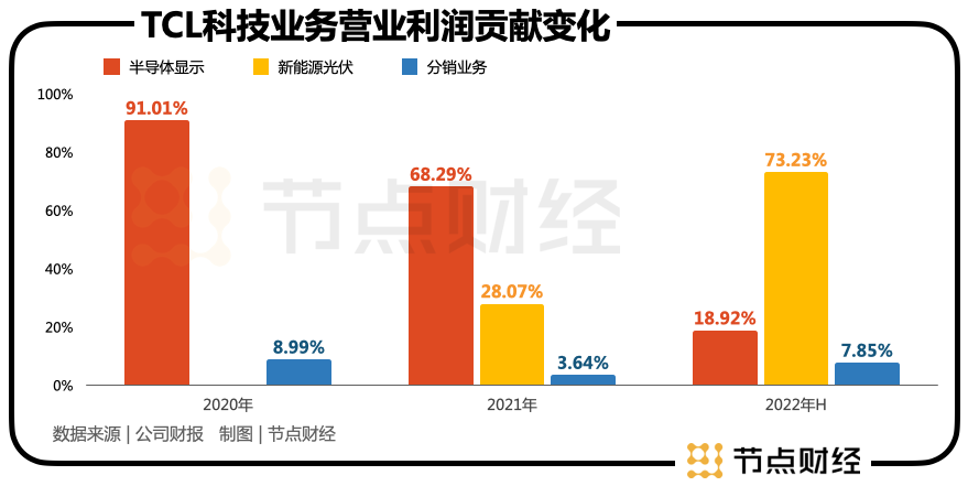 而在直接影響凈利潤大小的營業(yè)利潤方面,TCL科技面板業(yè)務比例從91%直降至約19%,新能源光伏營業(yè)利潤比例幾乎從0做到了超過七成。