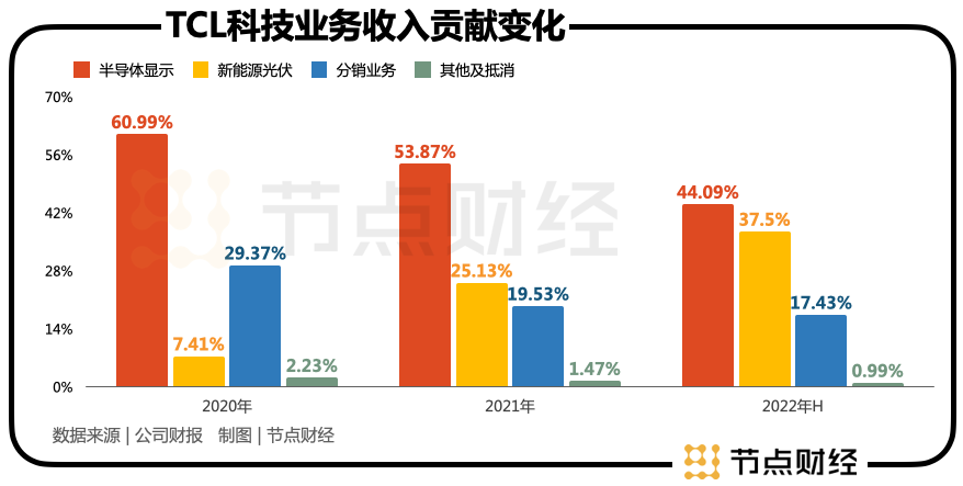 財務數(shù)據(jù)顯示,2020年-2022年上半年,TCL科技的兩大主營業(yè)務——半導體顯示(面板)與新能源光伏在收入比例上趨勢上呈現(xiàn)出此消彼長的勢頭。