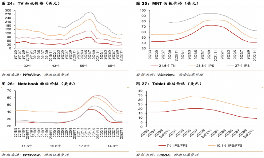 據(jù)西南證券統(tǒng)計,自2021 年下半年以來,面板價格出現(xiàn)結構性調整, TV、IT 類 LCD 產品價格出現(xiàn)不同程度下跌,持續(xù)時間超過1年。