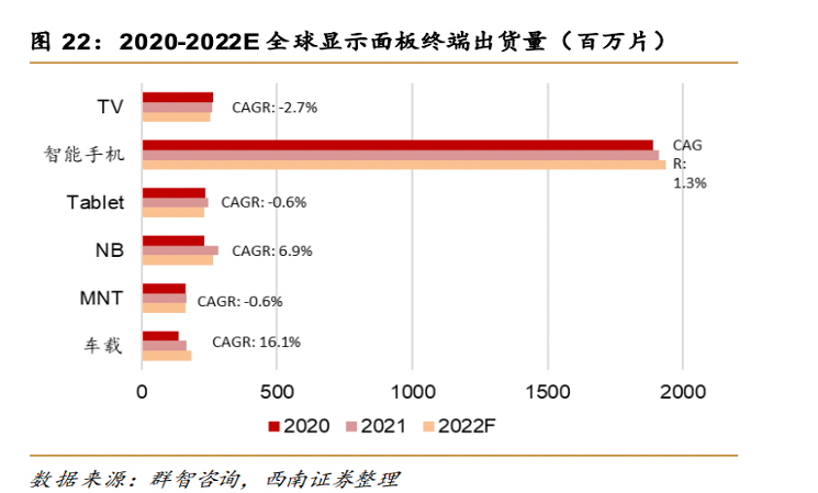 在市場增長方面,據(jù)群智咨詢預計,2022年,電視、手機、平板電腦、筆記本電腦、顯示器、車載顯示面板出貨量將分別為2.5、19.4、2.3、2.6、1.6、1.8億片。2020-2022 年,其對應的年復合增長率分別為-2.7%、1.3%、-0.6%、6.9%、-0.6%、16.1%。