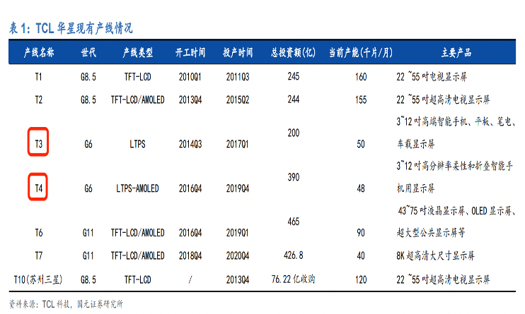 據(jù)國元證券整理,截止2021年,在TCL科技的7條面板產線中,用于生產中小尺寸的產線僅有2條(T3與T4)。另據(jù)公司2022年中報補充,T4產線尚在產能爬坡期,新增的一條定位于中尺寸IT和車載等新業(yè)務的t9產線剛完成點亮。