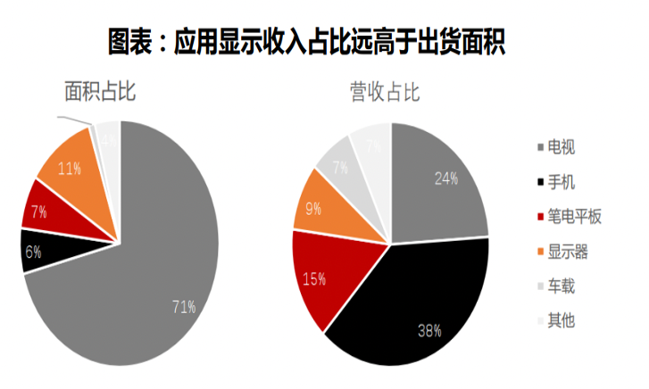 華西證券統(tǒng)計,2021年全球顯示面板中,按面積計算,電視占據(jù)了71%的份額,智能手機、筆記本電腦、顯示器及車載顯示合計不到25%。不過按產值計算,僅智能手機的份額就達到38%,超過電視的24%。