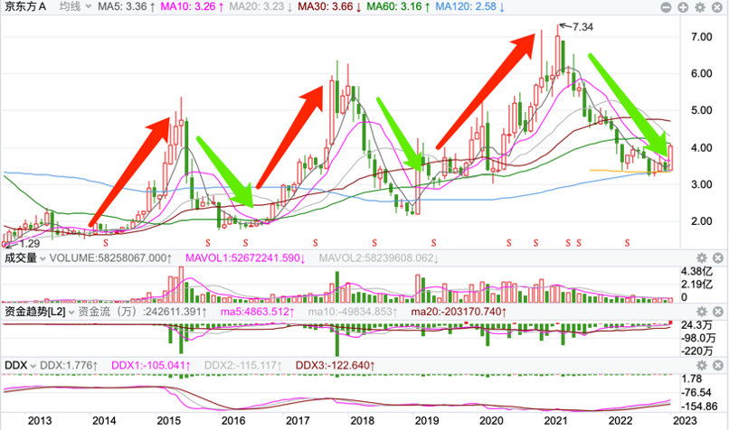 2014年-2022年,京東方的股價明顯經歷了三波周期。
