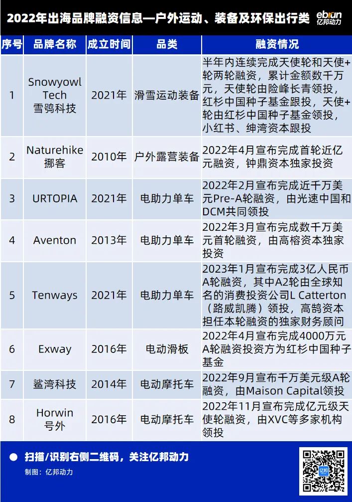 因此,一批走向歐美市場(chǎng)的、頗具潛力的戶外消費(fèi)品牌應(yīng)運(yùn)而生,包括戶外滑雪裝備、戶外露營(yíng)裝備、E-bike(電助力單車)、電動(dòng)滑板等多個(gè)大熱的品類。