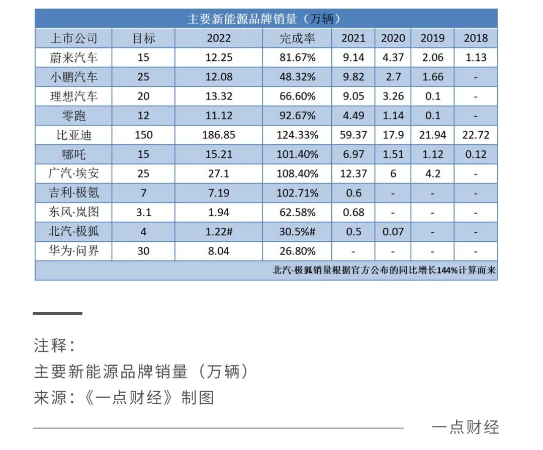 哪怕對“蔚小理”自己來說,這些銷量也是不夠的。定下2022年15萬目標(biāo)的蔚來汽車完成了81.67%;小鵬汽車25萬目標(biāo)銷量僅完成了48.32%;理想汽車的20萬目標(biāo)銷量則完成了66.6%。