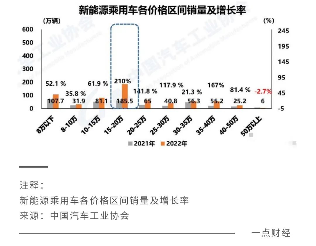 具體來看,去年一年新能源汽車的漲幅主要由15-30萬價格區(qū)間貢獻,中國汽車工業(yè)協(xié)會的數(shù)據(jù)顯示,15-20萬區(qū)間銷量增長了210%,20-25萬區(qū)間增長了141.8%,25-30萬增長了117.9%。同時,35萬-50萬價格區(qū)間也表現(xiàn)除了不錯的增長。