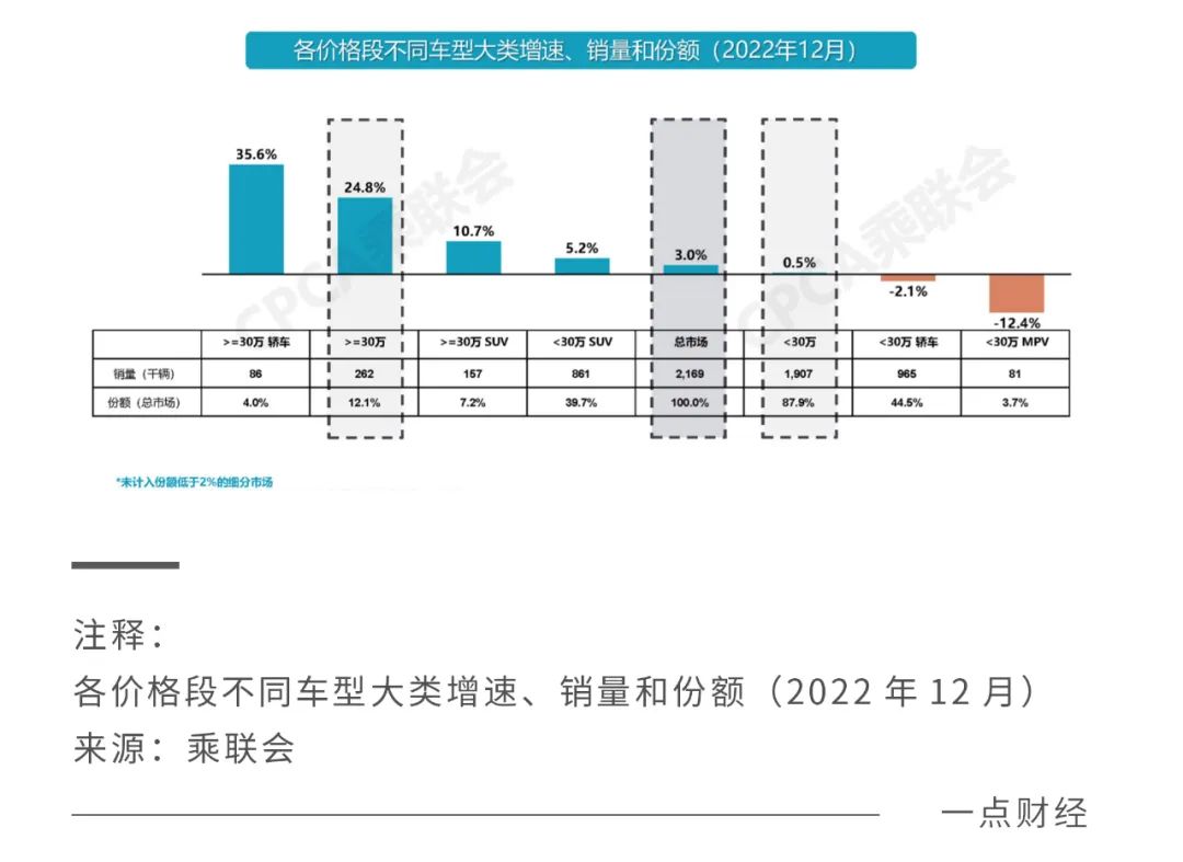 與沒有搶到理想市場相比,更致命的是30萬以上市場的容量本身是有限的。來自乘聯(lián)會的數(shù)據(jù)顯示,以2022年12月的銷量來看,30萬以上市場的份額為12%,月規(guī)模在26萬輛,其中又以SUV為主,月規(guī)模在16萬輛。