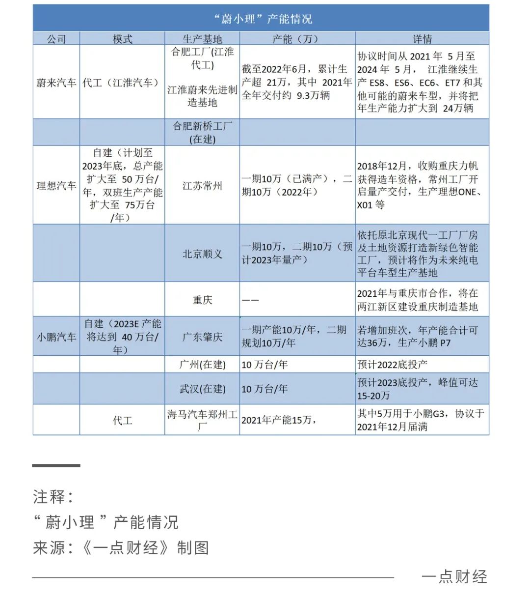 雖然耕耘多年,但產(chǎn)能仍然是制約新勢力發(fā)展的主要因素之一。近些年,“蔚小理”通過或收購、自建,或與傳統(tǒng)車企攜手方式,試圖補上產(chǎn)能短板,蔚來汽車就選擇了江淮汽車代工,理想選擇了自建工廠,小鵬則自建、代工兼有。
