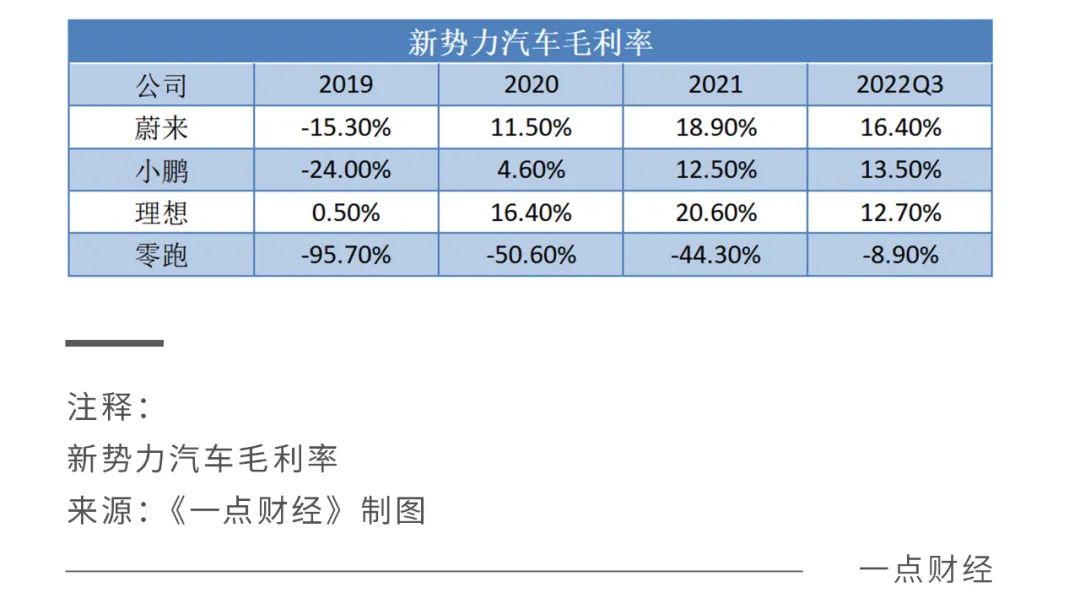 近年來,特斯拉汽車銷售毛利率都在25%以上,2022年達到了28.5%。而從《一點財經(jīng)》的統(tǒng)計來看,新勢力們的毛利率除了2021年理想汽車超過20%,近三年來“蔚小理”都在20%以下。
