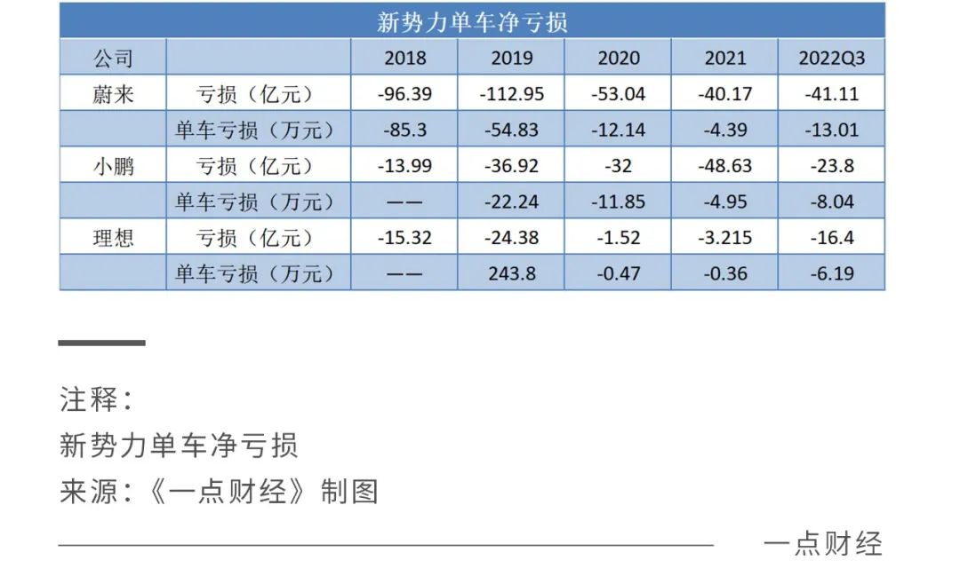 據(jù)《一點財經(jīng)》統(tǒng)計,從2018年到2022Q3,“蔚小理”的單車凈虧損有增有降,2020年三家的單車凈虧損分別為12.14、11.85、0.47萬元,2021年分別降低至4.39、4.95、0.36萬元,結(jié)果到了2022Q3,單車凈虧損則再度升至13.01、8.04、6.19萬元。