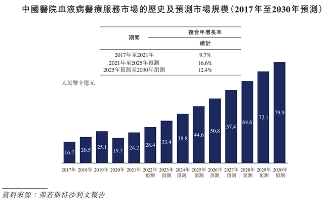 數(shù)據(jù)顯示,近年來我國血液病發(fā)病人數(shù)呈現(xiàn)出持續(xù)上升態(tài)勢(shì)。根據(jù)弗若斯特沙利文報(bào)告,中國血液病醫(yī)療服務(wù)的總市場(chǎng)規(guī)模從2017年的167億元增長(zhǎng)至2021年的242億元,復(fù)合年增長(zhǎng)率為9.7%。預(yù)期2025年進(jìn)一步增長(zhǎng)至446億元,2030年增長(zhǎng)至799億元,超過同期中國整體醫(yī)療服務(wù)市場(chǎng)的增長(zhǎng)。