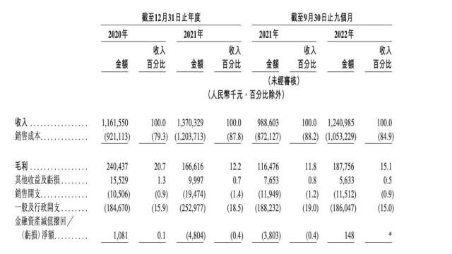 據(jù)招股書披露,2020年、2021年以及截至2022年9月30日止九個(gè)月,公司實(shí)現(xiàn)營(yíng)業(yè)收入分別為人民幣11.61億元、13.7億元以及12.41億元。