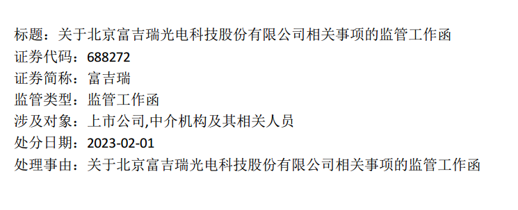 2月1日,包括富吉瑞(688272.SH)、興圖新科(688081.SH)、*ST澤達(688555.SH)、國盾量子(688027.SH)、中炬高新(600872.SH)、*ST安控(300370.SZ)和博匯科技(688004.SH)在內的7家上市公司收到交易所下發(fā)的監(jiān)管工作函,其中有公司涉及重大訴訟的進展事項,但更多公司主要涉及關于年報、審計和日常經(jīng)營的常規(guī)事項提示。