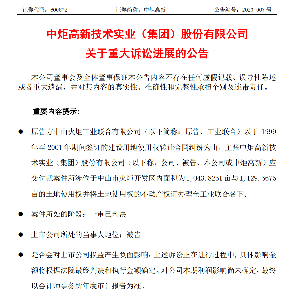 翻閱早前公告可以看到,1月30日,中炬高新曾披露重大訴訟進展的公告,原告方工業(yè)聯(lián)合以于1999年至2001年期間簽訂的建設用地使用權轉讓合同糾紛為由,主張中炬高新應交付就案件所涉位于中山市火炬開發(fā)區(qū)內面積為1043.83畝與1129.67畝的土地使用權并將土地使用權的不動產(chǎn)權證辦理至工業(yè)聯(lián)合名下。