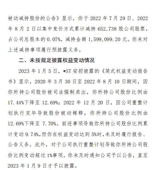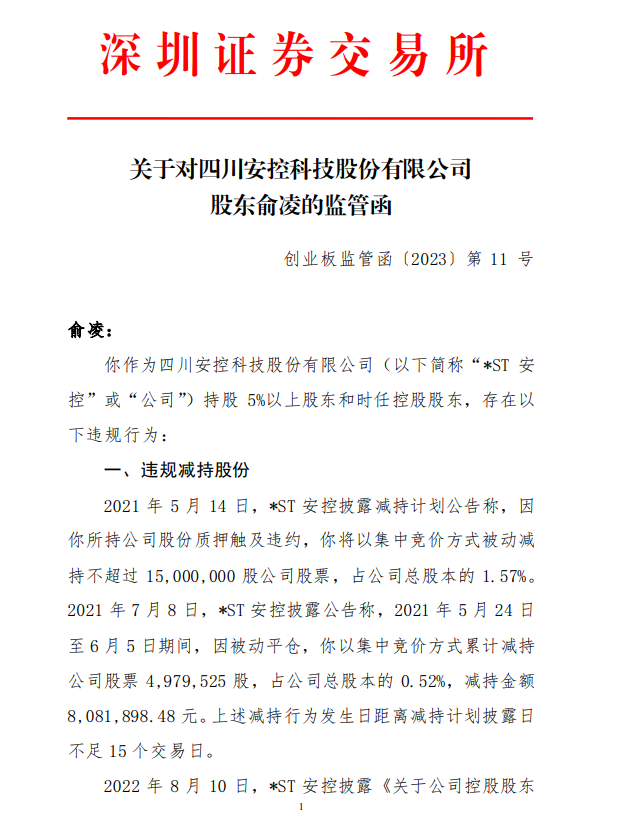 與上述公司不同,*ST安控收到是關于公司時任控股股東俞凌的監(jiān)管函,深交所稱俞凌存在違規(guī)減持股份和未按規(guī)定披露權益變動情況,其中包括減持行為發(fā)生日距離減持計劃披露日不足15個交易日、未對所涉減持金額159.91萬元的減持事項履行預披露義務,以及在權益變動達到5%時,未及時履行報告、公告義務等。