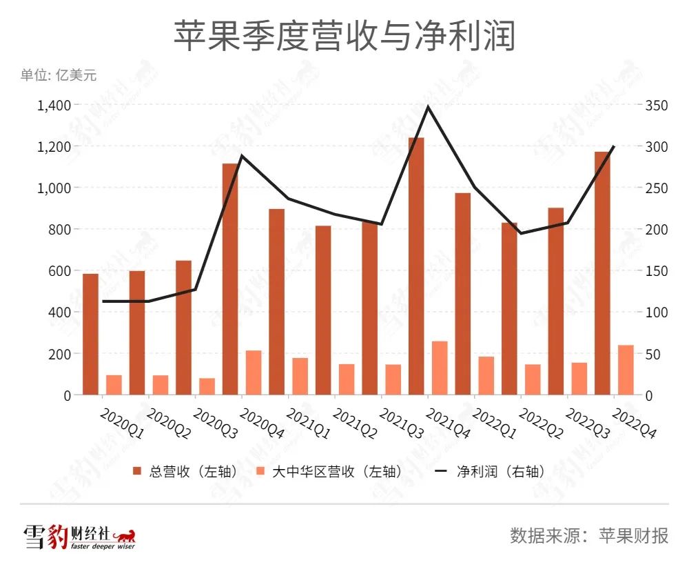 2022年Q4(蘋果的2023財(cái)年Q1,下文均以自然年計(jì)),蘋果的營(yíng)收與凈利潤(rùn)分別同比下降5.48%和13.38%。上一次蘋果單季營(yíng)收同比下滑,還是在2019年Q1。