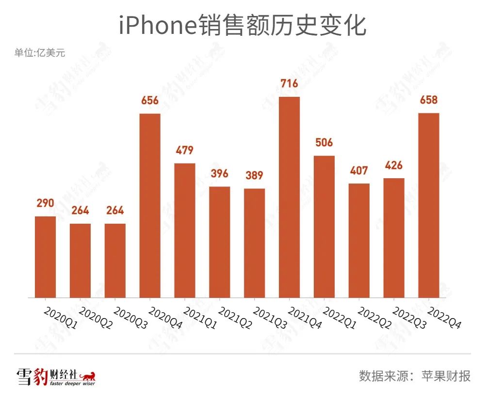 2022年Q4,iPhone的銷售額同比下降8.17%至657.75億美元,低于此前華爾街給出的682.9億美元的預(yù)期。