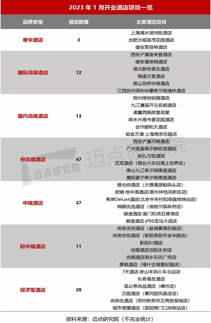 品牌酒店開業(yè):據(jù)邁點研究院不完全統(tǒng)計,2023年1月新開業(yè)151家酒店,環(huán)比增長14.4%,類型橫跨全品類。酒店類型占比上,中高端酒店最多,47家,智選假日酒店開業(yè)突破7家;其次是中端酒店,37家;經(jīng)濟型酒店以28家的數(shù)量排名第三;然后是國內(nèi)高端酒店、國際高端酒店和輕中端酒店。1月開業(yè)酒店項目激增,洲際等國際酒店品牌市場仍在加速布局,維也納酒店、全季酒店等多個品牌均在1月發(fā)力,實現(xiàn)多店齊開的突破,連鎖品牌在市場擴張過程中,不斷迭代升級自身產(chǎn)品結(jié)果和戰(zhàn)略布局,聚焦下沉市場,中端酒店市場的競爭也愈發(fā)激烈。