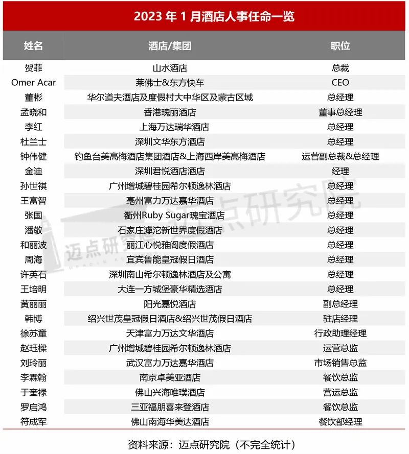酒店人事任命:據(jù)邁點研究院不完全統(tǒng)計,2023年1月共有29位高管履新,其中涉及文華東方酒店、瑰麗酒店、美高梅酒店、萬達酒店等數(shù)十個高端酒店。酒店各職務(wù)人才的變動和優(yōu)化,將助于提升酒店品質(zhì)、提高協(xié)作效能。