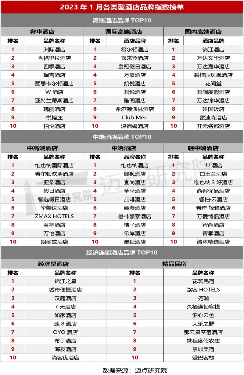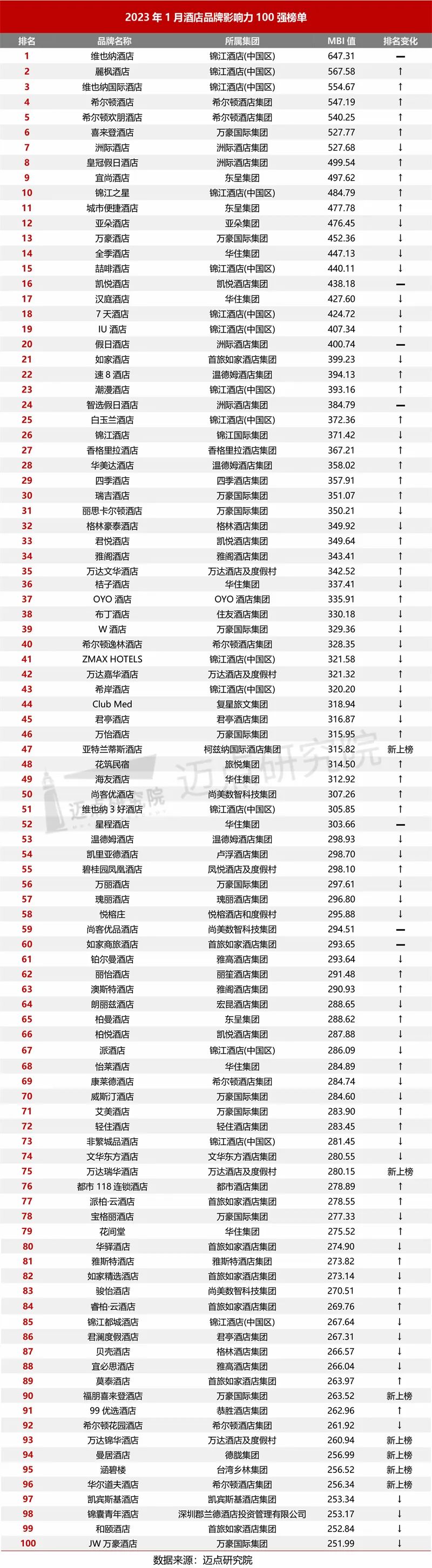 以下是邁點研究院獨家發(fā)布的“2023年1月酒店品牌影響力100強榜單”。 本月, 維也納酒店、麗楓酒店、維也納國際酒店位列前三,另希爾頓酒店、希爾頓歡朋酒店、喜來登酒店、洲際酒店、皇冠假日酒店、宜尚酒店、錦江之星進入榜單前十。本月100強榜單中,共有42個品牌排名環(huán)比上升,44個品牌排名環(huán)比下降,7個品牌排名沒有發(fā)生變化。本月共有7個酒店品牌新晉百強榜單,分別為:亞特蘭蒂斯酒店、萬達瑞華酒店、福朋喜來登酒店、萬達錦華酒店、曼居酒店、涵碧樓、華爾道夫酒店。