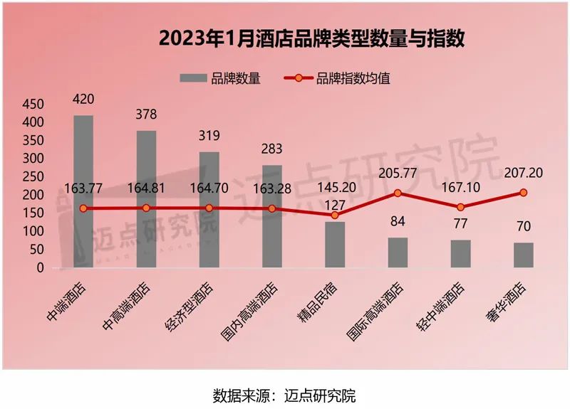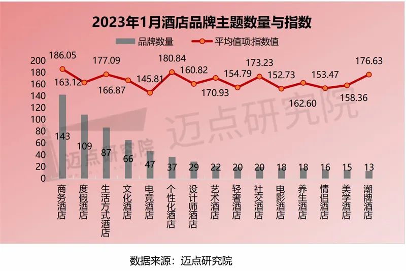 據(jù)邁點研究院數(shù)據(jù)顯示,2023年1月酒店主題數(shù)量分布中,商務(wù)酒店占比最多,多達143個;潮牌酒店占比最少,僅有13個。品牌指數(shù)均值來看,商務(wù)酒店、個性化酒店、生活方式酒店位列前三;電競酒店品牌指數(shù)均值最低,為145.81 ,其品牌處于市場培育期,相對小眾。從品牌指數(shù)的環(huán)比變化來看,養(yǎng)生酒店、設(shè)計師酒店增幅較為明顯,主要因為“群體免疫”過后療愈的需求急劇增加。