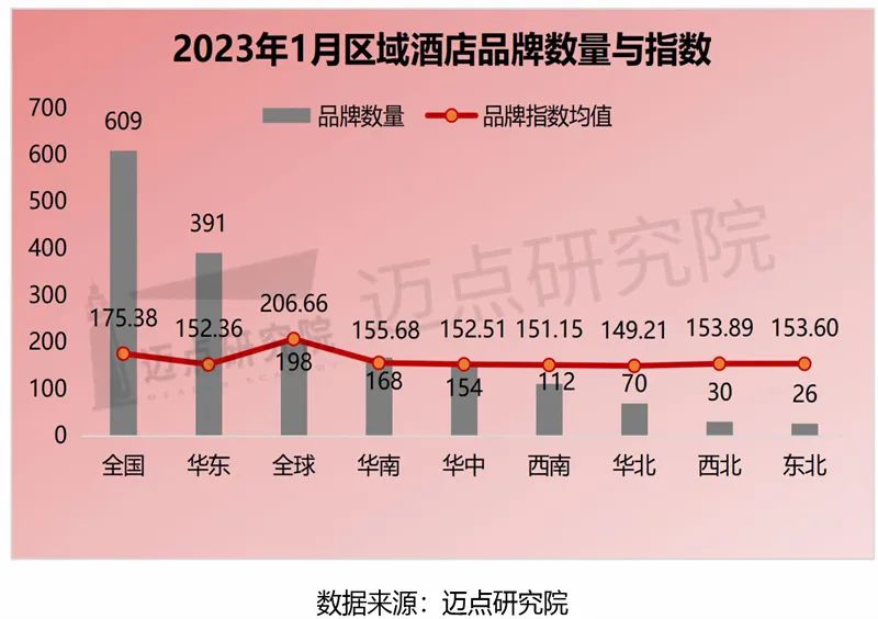 2023年1月區(qū)域酒店分布中,全國性品牌數(shù)量最多,有609個;其次是華東區(qū)域品牌,有391個;再次為全球性品牌,有198個。從各區(qū)域酒店品牌指數(shù)來看,全球性品牌以絕對性的優(yōu)勢領(lǐng)先,其次分別為全國、華南、西北、東北、華中、華東、西南、華北。各區(qū)域品牌指數(shù)平均值為161.16,全球性、全國性品牌高于平均值。