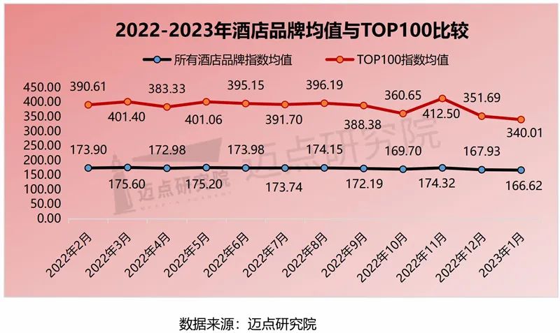 1月百強榜單和整體酒店品牌指數(shù)均呈下降態(tài)勢,2023年1月TOP100品牌值均數(shù)為340.01,環(huán)比下降3.32%;整體酒店品牌指數(shù)均值166.62,環(huán)比下降0.78%。從數(shù)據(jù)可知,整體品牌指數(shù)均值與TOP100呈現(xiàn)較大差距,但整體有縮小的趨勢,反映出頭部品牌具有較高的市場關(guān)注度和認可度,頭部品牌具備市場歡迎度高、客戶觸達范圍廣、住店服務(wù)體驗佳、服務(wù)品質(zhì)有保障等多重優(yōu)勢,因而無論是投資人還是普通游客,都會將其作為優(yōu)選對象,但其他品牌也在不斷提升自身產(chǎn)品競爭力,優(yōu)化服務(wù)品質(zhì),從多層面縮小與頭部品牌的差距。