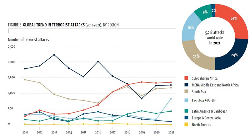 當(dāng)年全球發(fā)生了5218起恐襲,其中26%在撒哈拉以南非洲,為各地區(qū)中最多;恐襲致死人數(shù)中也有48%來自撒哈拉以南非洲。